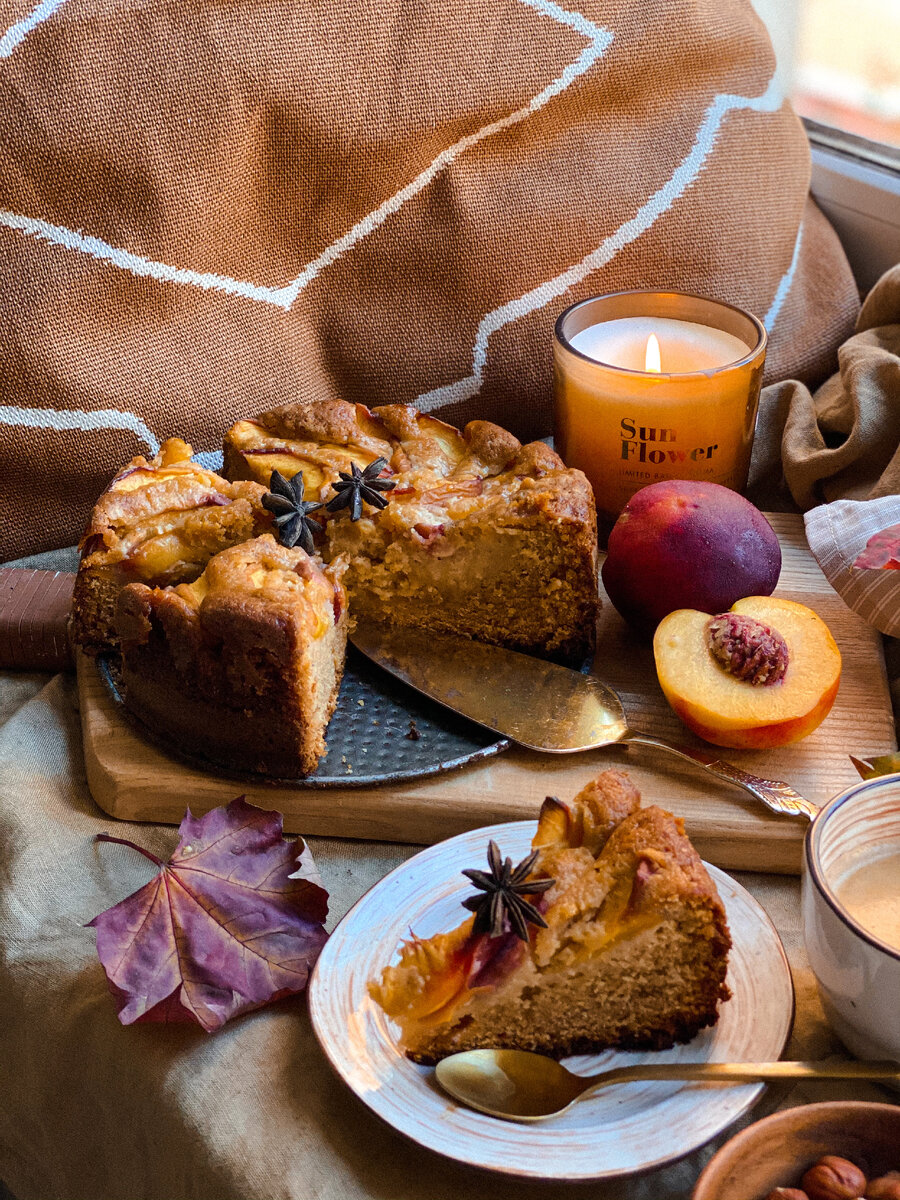 Чем хуже погода - тем чаще хочется готовить что-то вкусное. Вот ещё один простой пирог на осень! Вам потребуется: Приготовление: Нектарины режем на тонкие дольки. Кладём в чашу и посыпаем парой ложек тростникового сахара. В другой чаше соединяем сахар (180 гр.) и сливочное масло комнатной температуры. Хорошо взбиваем миксером на максимальной скорости, масса станет белее и пышнее. Добавляем туда яйцо и нейтральный йогурт (Активиа отлично подойдёт), экстракт ванили. Добавляем обычную муку, затем фундучную мука. Если фундучной нет, можно заменить миндальной или 50 гр. обычной. Добавляем разрыхлитель и соду. Взбиваем пару минут. Форму (18-20 см) смазываем маслом и делаем французскую рубашку. Выкладываем тесто, а сверху - дольки нектаринов, чуть вдавливая их в тесто. Выпекаем 10 минут при 175’, потом понижаем температуру до 160 и держим в духовке ещё 30-45 минут. Должна появится золотистая корочка. Готовность проверяем шпажкой. На заметку: Фундучная мука придаёт очень классный ореховый вку