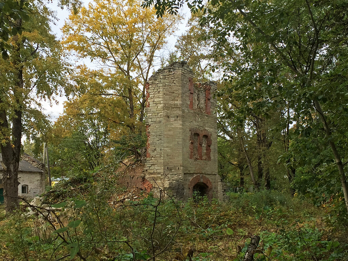 Водонапорная башня с многоэтажный дом и другие руинированные постройки некогда богатой усадьбы Сельцо (Ленинградская область)
