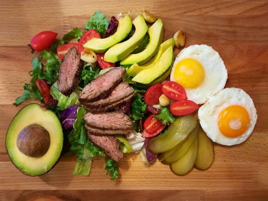 На сервировочную доску/тарелку выложите горсть салата, порезанный полосками стейк, нарезанные слайсами авокадо и огурцы, яичницу, томаты черри, чеснок, все посолить и поперчить, сдобрить лимонным соком и маслом, подать.