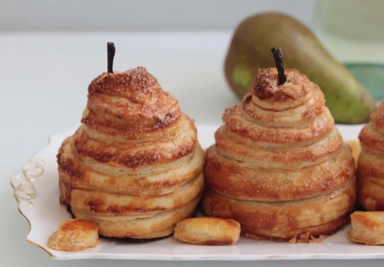 Груши чистим и режем полукольцами. На сковороду кладём сахар, растворяем его, как только сахар потемнел добавляем масло, перемешиваем и добавляем груши. Даём грушам протомиться в карамели пару минут и выключаем. Тесто не раскатываем!!! Делим каждый пласт теста на три части, формируем бортики и вилкой протыкаем серединку. В каждую слоечку кладём но ложечке творожного сыра и раскладываем груши. Смазываем бортики оставшимся карамельным сиропом и выпекаем при 180 градусах 15 минут. Приятного аппетита