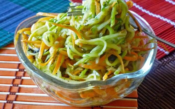Когда кабачок пустил сок, промываем его и сливаем всю жидкость. Соединяем кабачок с морковью и заливаем заправкой.