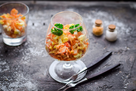 Этот популярный салат можно готовить хоть каждую неделю дополняя им мясные блюда. Он получается очень пикантным по вкусу именно за счет присутствия корейской морковки, которую вы так же можете приготовить сами или купить в магазине. Рецепт салата вы найдете на нашем сайте: Крабовый салат с корейской морковью Источник: https://kopilka-kulinara.ru/salaty/krabovye_salaty/krabovyj-salat-s-korejskoj-morkovyu/