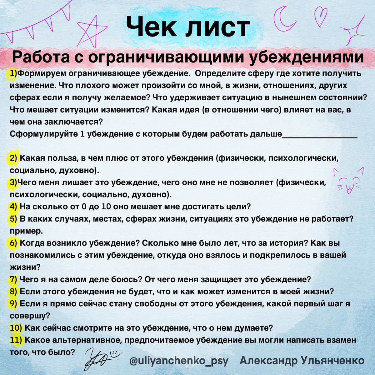 •Дак вот, этот чек лист составлен специально для обнаружения проблемных убеждений, и их деконструкции. Желательно отвечать на вопросы письменно, по порядку, уделить этому немного времени.