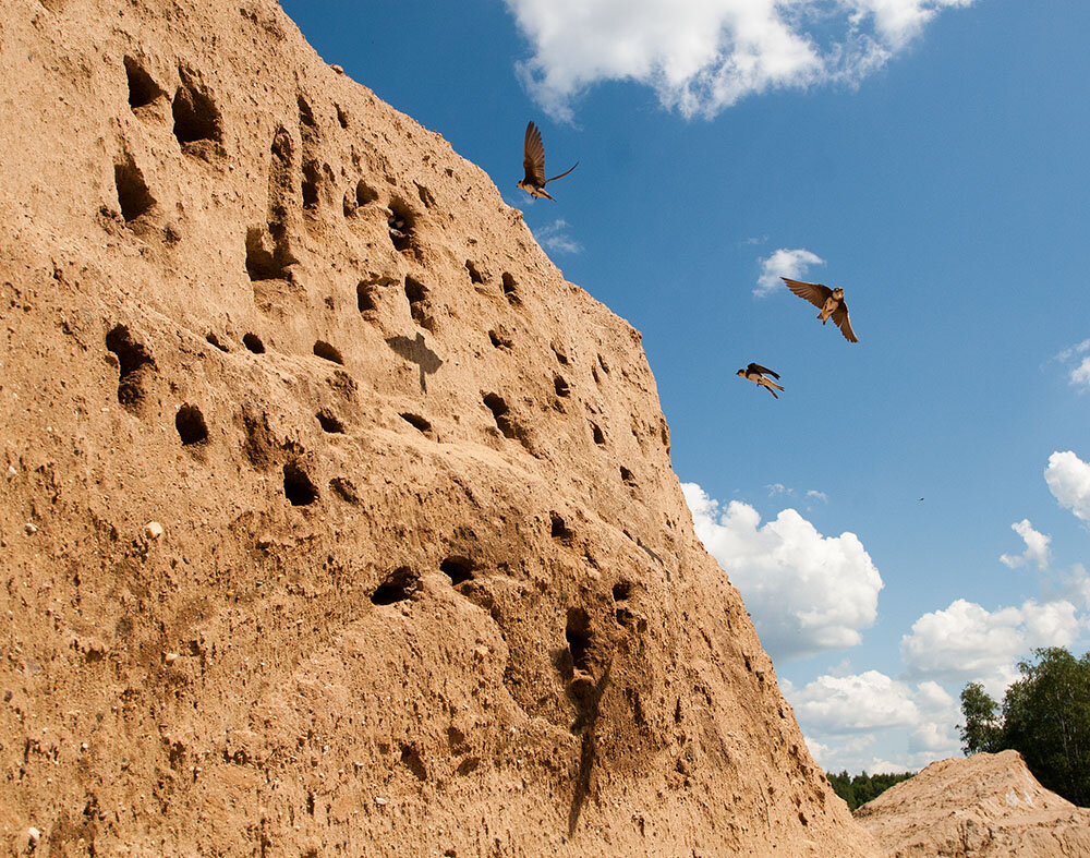 Береговушек без труда зачислит в ласточки даже несведущий в орнитологии человек. Это небольшая по размерам птица имеет столь стремительный полёт, что наблюдать её в воздухе так же непросто, как следить за летающими стрижами. Полукруглые, длинные крылья и короткие ноги расскажут, что это профессионал, если дело касается полёта. Ласточки неутомимо летают над водой, и кажется, что их крыльям не требуется отдых. В воздухе они ловят насекомых, на лету пьют воду, собирают строительный материал, здесь общаются с соседями по колонии. Часами эти птицы могут быть в полёте, резко пикируя почти до касания с землёй, и взмывая вверх, пропадают из вида в небесной синеве. Впрочем, в период гнездостроения береговушки не удаляются далеко от своей колонии. Для ловли насекомых ласточкам нужен простор и не случайно они выбирают место для устройства гнезд рядом с водой. Возле воды, над рекой, если она спокойно течет среди лугов и полей, всегда много летающих насекомых и береговушкам можно не отлучатся далеко от будущих гнезд. Но даже если колония небольшая, на прокорм взрослым птицам и их птенцам требуется много летающих насекомых, поэтому к середине лета, когда молодые станут на крыло ласточкам приходиться летать за кормом далеко.