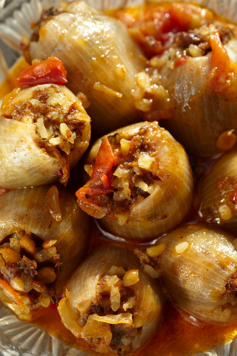 Долму в Ордубаде готовят из такого разнообразия овощей, фруктов, трав, листьев и кореньев, что хватит на целый алфавит, – от айвы до яблок. Вам потребуется (на три порции): Способ приготовления: Лук очистите. Одну луковицу нашинкуйте и пассеруйте в топленом масле, остальные слегка отварите в чуть подсоленной воде, так чтобы можно было вытащить сердцевинки и оставить целыми «чашечки». Сердцевинками выложите дно кастрюли. Мясо пропустите через мясорубку, добавьте сваренный до полуготовности рис, вареный нут, нашинкованные кинзу, лепестки чайной розы и желтого ириса, пассерованный лук, соль и перец. Тщательно перемешайте фарш и начините им луковицы. Выложите их на дно кастрюли. Залейте соусом (1/2 стакана кипятка, сахарный песок, винный уксус) и томатной пастой. Закройте крышкой и тушите на медленном огне около получаса. К долме подают гатыг – натуральный или с тертым чесноком. Долму делают повсюду в Азербайджане. И везде вкусно. Но если бы мы устроили слепую дегустацию, то обнаружили бы,