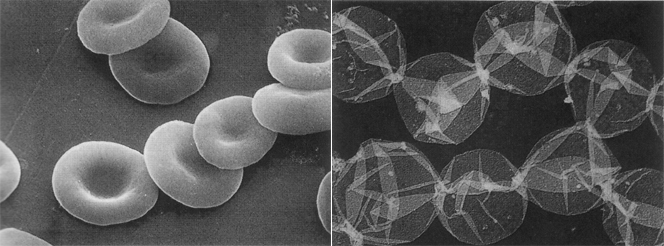Эритроциты — красные клетки крови у позвоночных и некоторых беспозвоночных (иглокожих). Красные кровяные клетки — эритроциты — очень малы: в 1 мм3 крови содержится до 5 млн. эритроцитов. Зрелые эритроциты не имеют ядер. Под микроскопом эритроциты выглядят как двояковогнутые диски. Такая форма увеличивает поверхность эритроцитов, а это способствует более быстрому и равномерному проникновению в них кислорода. Снаружи эритроцит покрыт мембраной, внутри него содержится особый белок — гемоглобин, придающий эритроциту красный цвет. Поверхностная мембрана легко пропускает газы, воду, анионы, ионы водорода, глюкозу, обладает большой эластичностью. Эритроциты зарождаются в красном мозге, живут около 120 дней и разрушаются в селезенке и печени. Железо, освободившееся после распада гемоглобина, откладывается в печени и селезенке как резерв и по мере надобности отсюда поступает в костный мозг, где вновь включается в молекулы гемоглобина. У здорового человека в сутки при распаде эритроцитов ос