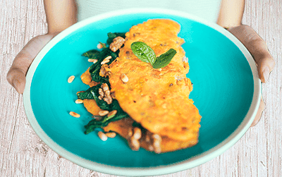 127,7 ккал в 100 граммах Ингредиенты: Овсянка 40г. Яйцо 2шт. Помидор 100г. Перец сладкий 100г. Оливковое масло Петрушка по вкусу Соль по вкусу Сыр (низкокалорийный)30г. Способ приготовления: Куриные яйца вбить в емкость. Всыпать 2 столовые ложки овсянки и оставить на 10 мин. После взбейте все это венчиком или вилкой. Сковороду разогреть и налить немного оливкового масла,вылейте содержимое на сковороду,накройте крышкой и пусть готовится на медленном огне. Когда блин будет готов на половину, на одну его сторону выложите мелко нарезанные овощи и посыпьте их твердым сыром,сверните блин вдвое. После этого оставить под крышкой 5 минут на маленьком огне. Можно добавить любые овощи по вкусу
