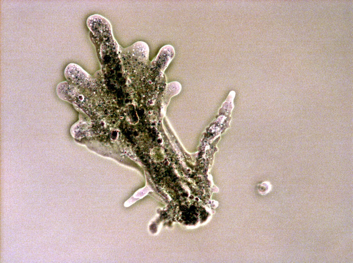 Амебы— класс наиболее просто организованных простейших. Лишены внутреннего скелета. Форма тела непостоянна. Передвигаются амебы, «перетекая» с одного места на другое. Питаются бактериями, одноклеточными водорослями. Размножение бесполое. При неблагоприятных условиях амебы образуют цисты. Образование цисты способствует не только выживанию в неблагоприятных условиях, но и распространению простейших. Многие амебы безобидны и составляют звено в цепи питания животных. Дизентерийная амеба «ввинчивается» в стенки кишечника, пожирая их ткани и красные кровяные клетки. У человека в этом случае возникает тяжелое заболевание — амебная дизентерия. До сих пор не выяснена причина, почему постоянно живущая в кишечнике человека амеба может превратиться в пожирателя клеток. В прудах, в пресных водоемах в больших количествах живет другой вид амеб — раковинные амебы, или корненожки. Во всем они похожи на обыкновенных амеб, но отличаются наличием раковины. Строятся эти раковины из проглоченных ам