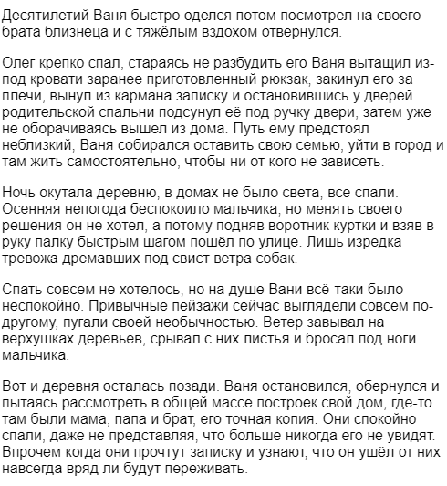 Я ухожу навсегда, искать меня не надо. Вы всё равно меня не любите, — прошептал мальчик и ушёл в темноту