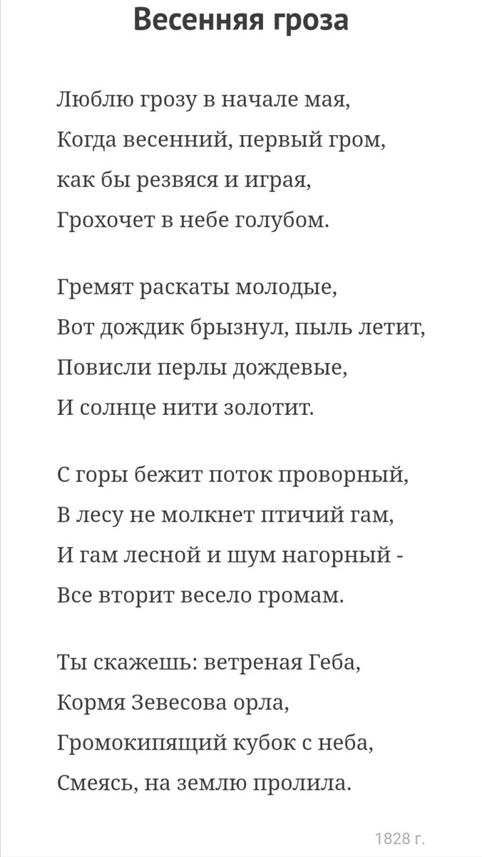 Стихотворение "Весенняя гроза" было написано Тютчевым в 1828 году. В 1854 году автор изменил его именно вторая версия стала известна. Жанр стихотворения- пейзажная лирика с элементами философского рассуждения. "Весенняя гроза" показывает, что человек и природа едины. Для этого автора использует эпитеты, метафоры и олицетворение, которые придают грозе характерные для людей черты. Тютчев создают своеобразный звуковой "рисунок" речи с помощью аллитерации. Стихотворный размер" Весенняя гроза" - четырёхстопный ямб с пиррихием и прекрасной рифмовкой. Произведение разделяется на три части. Первая часть описывают грозу, вторая сравнивается человеком, третья наделяет стихотворение философским характером. Мне нравится, что Тютчев не просто описывает красоту природы, а вкладывает глубокий смысл в своё произведение. Стихотворение Тютчева "Весенняя гроза" считается классикой. В наше время это произведение всё ещё актуально