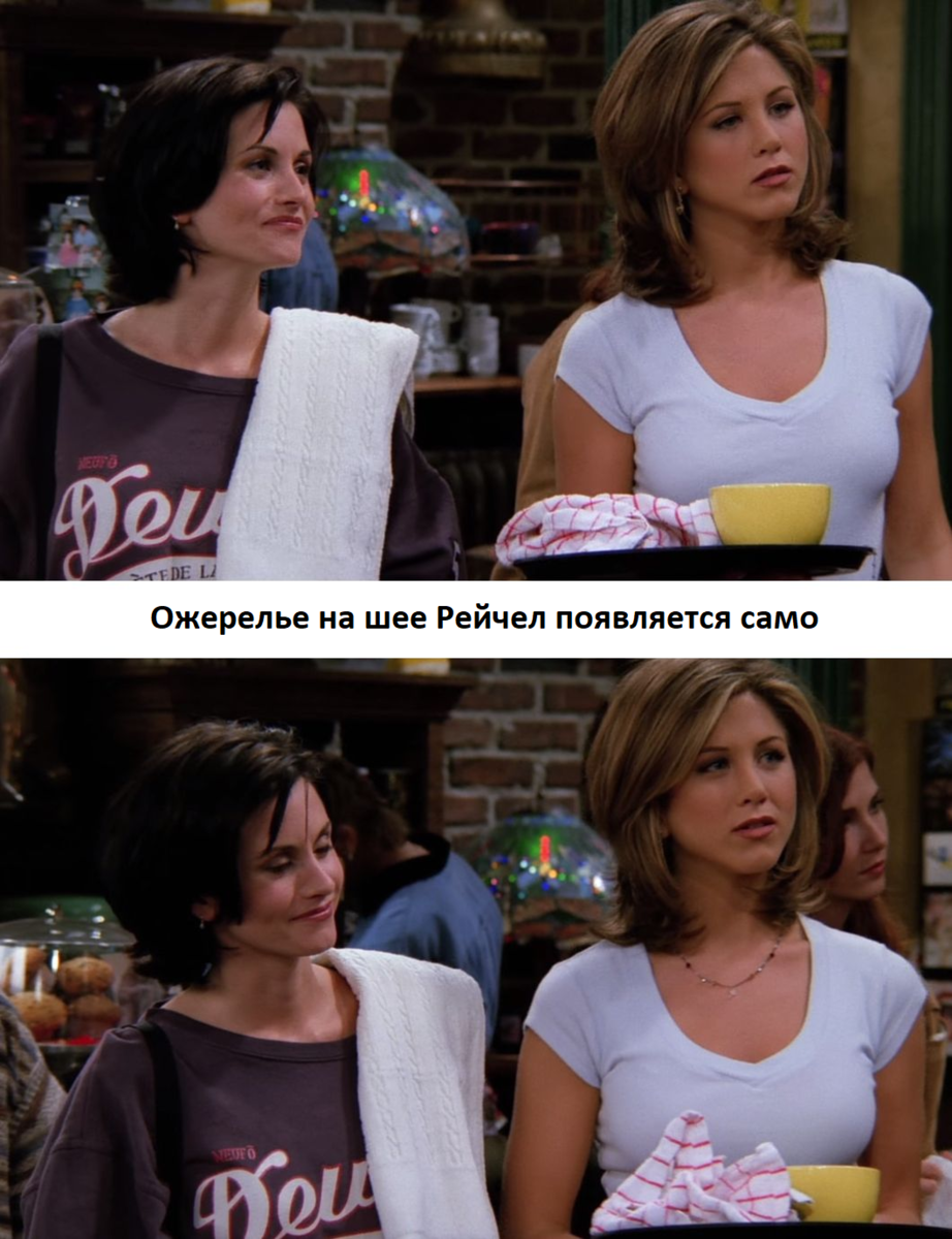В сериале "Друзья" происходило много весёлого, странного и абсурдного. Но всё это было запланировано создателями. Однако, часть по-настоящему мистических моментов, видимо, произошла по недосмотру. Выкладываю тут некоторые из них.