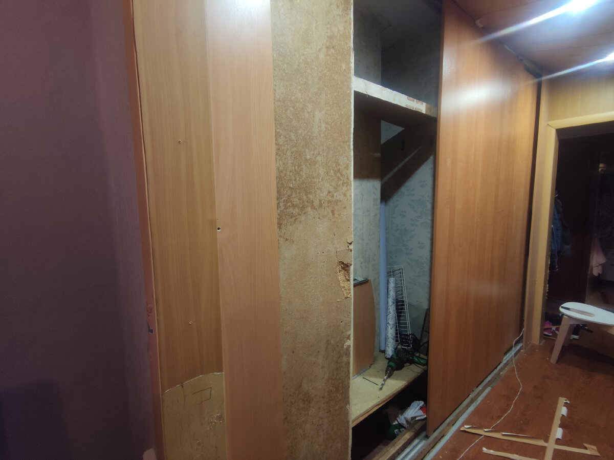 Приветствую вас мои подписчики и случайные гости моего канала. Где расположена и как выглядит моя новая квартира, вы можете посмотреть у меня на канале. И так, дошли мои руки до встроенного, кое как построенного шкафа. Вещей у меня много, а хранить негде и поэтому, нужно привести в нормальный и функциональный вид шкаф. Шкаф очень большой Внутри сделаны непонятные полки и на стенах приклеены советские обои. Первым этапом я решил разобрать почти всю конструкцию и демонтировать одну стенку. Совсем не понятно зачем её сюда прикрутили. Далее приступил к демонтажу обоев. В итоге получилось вот так После демонтажа, монтажной пеной заделал все отверстия в стене и возле напольного плинтуса. На данный момент ремонт шкафа приостановлен, так как жду колёса на двери шкафа, которые я заказал в интернете, ибо они были утеряны предыдущими хозяевами. Им то не мешало. Сейчас в раздумьях, что сделать со стенами в шкафу. Изначально хотел сделать их текстурированными, а сейчас впал в сомненья, в общем д