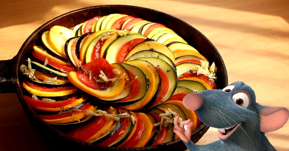 Каждый ребенок и не только ребенок смотрели это замечательный семейный мультфильм, так вот, есть рецепт этого блюда. Продукты для приготовления Рататуя от Реми Порций 5 Соус Заливка Овощная составляющая Как приготовить 1. Для начала приготовим соус. Лук и чеснок очистить и мелко нарезать. 2. Нагреваем в сковороде оливковое масло, добавляем репчатый лук с чесноком и тушим на медленном огне примерно 8 минут. Они не должны зазолотиться, а лишь стать мягкими 3. Помидоры надрезать крест-на-крест и залить кипятком, затем обдать холодной водой и очистить от шкурки. Помидоры нарезать небольшими кубиками. Перец и сельдерей мелко нарезать. 4. Добавляем к луку и чесноку перец, помидоры и сельдерей. Высыпаем чайную ложку прованских трав. Можно плеснуть немного воды или белого сухого вина – Франция, куда от вина деться. 5. Тушим на маленьком огне около 10 минут так, чтобы практически вся жидкость выпарилась, но не зажариваем. Солим по вкусу. 6. Духовку разогреваем до 180 градусов. Цукини, баклажан