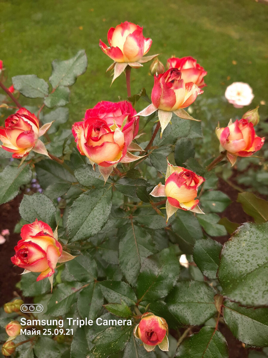 Сложно вообще чему-то радоваться, когда за окном всё серое и унылое, неделю подряд льют дожди, а розы не смогли показать всю свою красоту. Но ежедневно я выхожу в сад и фотографирую, потому что придёт время, когда мы будем пересматривать фотографии и радоваться даже этим скромным краскам осени! Эта неизвестная красавица восхищает меня своим жизнелюбием, богатырским здоровьем, обильным цветением и отличной устойчивостью к затяжным осадкам. Отлично держится и Мариятерезия. Её лепестки намокли, но сильные побеги способны удерживать целое соцветие прекрасных махровых цветов. Осенний цвет гораздо ярче летнего! Она одна из немногих роз показала обильное и длительное, более 10 дней, цветение во вторую сентябрьскую волну. На её долю выпали абсолютно все ливни! По возрасту она "старушка", примерно 12 лет. Как видите по числам, ещё одна роза обладает всеми теми же свойствами, что и Мариятерезия. По возрасту они тоже одинаковы. Но есть один минус. Во вторую волну ЛеонАрдо даёт слишком много