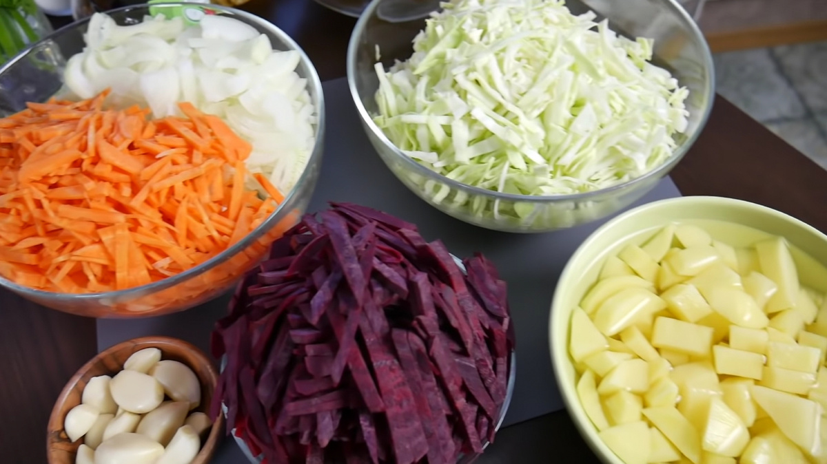 Ингредиенты (на 2 литра бульона): 500г мяса на кости 200г свёклы 150г капусты 110г картофеля 100г моркови 100г лука репчатого 2 ст.л. Томатной пасты 2 ч.л. Сахара 2 ч.л. Уксуса 9% Чеснок Зелень Перец болгарский Соль Растительное масло для зажарки Приступим к готовке)) Приятного аппетита!))
