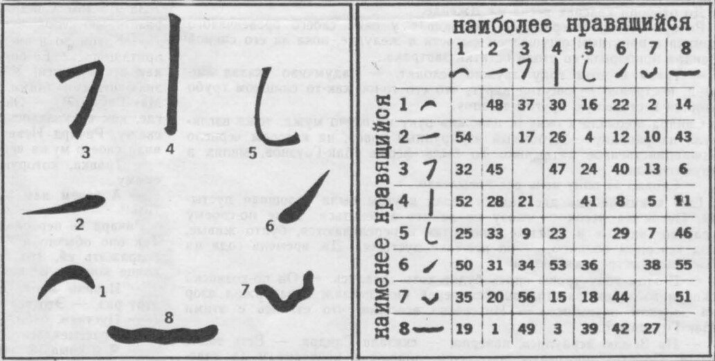 Если вы хотите исследовать с помощью этого теста группу своих друзей и знакомых, попросите каждого из них сделать свой выбор про себя, а не вслух. Дело в том, что выбор одного человека может невольно повлиять на выбор другого, в это исказит результаты. Результаты могут быть искажены еще и вследствие того, что наиболее и наименее нравящийся знак выбраны торопливо, наугад, так что этот выбор не отражает истинных предпочтений участвующего в опыте.