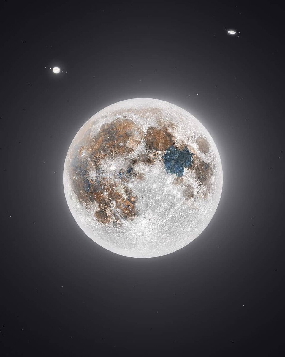 На этом фото отлично видно, как Юпитер и Сатурн расположились на заднем фоне Луны. Как и в прошлом году два газовых гиганта будут подходить все ближе и ближе друг к другу, пока не встретятся. В 2020 году планеты сошлись в единый объект на небе в конце декабре. В народе называли это явление "Вифлеемской звездой".