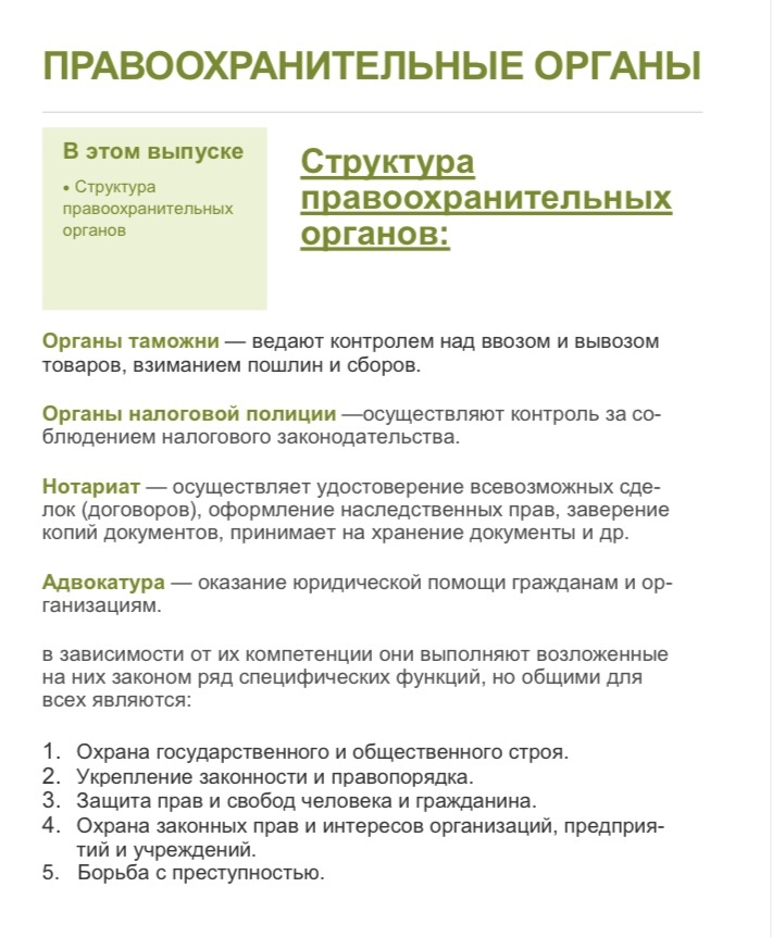 Органы таможни — ведают контролем над ввозом и вывозом товаров, взиманием пошлин и сборов Органы налоговой полиции — осуществляют контроль за соблюдением налогового законодательства. Нотариат — осуществляет удостоверение всевозможных сделок (договоров), оформление наследственных прав, заверение копий документов, принимает на хранение документы и др. Адвокатура — оказание юридической помощи гражданам и организациям. в зависимости от их компетенции они выполняют возложенные на них законом ряд специфических функций, но общими для всех являются: