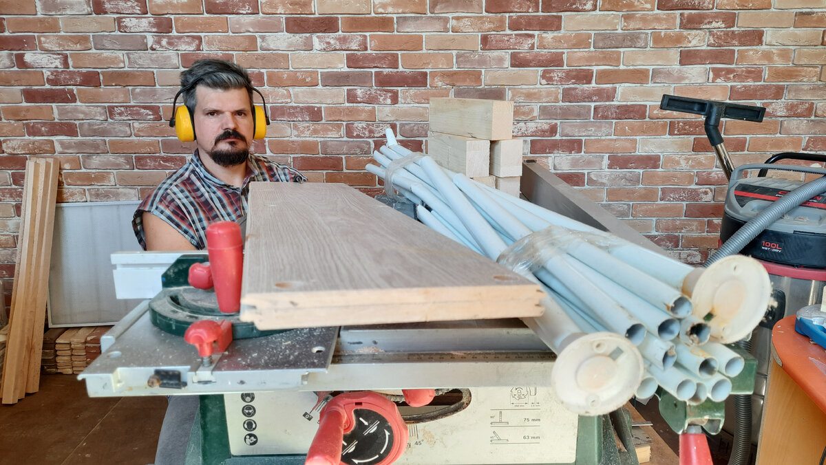 С приходом осени обнаружил, что живу в доме с многоножками :) Поэтому решил на скорую руку придать хранению семейной обуви подобие порядка. Делать буду открытую обувницу в виде стеллажа, из того, что оказалось под рукой. В сарае нашёл металлические трубки о старого садового навеса и две панели ламината толщиной 18 мм, которые могут выдержать нагрузку обуви без провисания. Приступаем! По моей задумке, металлические трубки будут расположены вертикально и служить несущими стойками. А для жесткости всей конструкции добавил вставки из сосновых брусков сечением 40 х 40 х 60 мм. Начинаю со сверления сквозных отверстий- через них буду продевать металлические трубки каркаса будущей обувницы. Сверло форстнера взял равным диаметру трубок. После чего стесал край брусков рубанком. Теперь пришла очередь ламината. Рассчитал и разметил расположение центров стоек и на сверлильном станке также высверлил сквозные отверстия. По шесть на каждом уровне, чтобы максимально нивелировать провисание в будущем