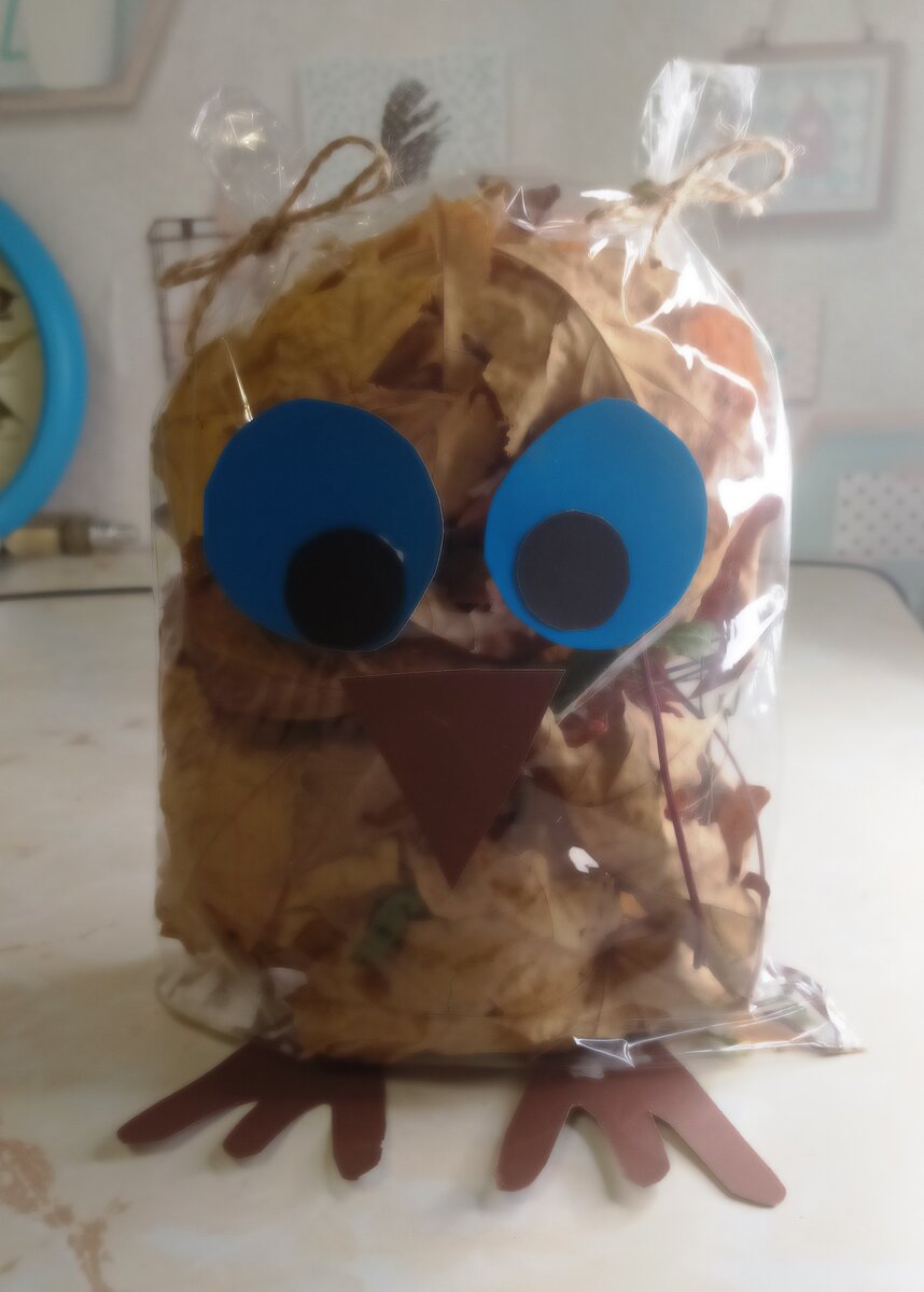 Всем привет) Сегодня я к Вам с замечательнейшей поделкой для детского сада - совjq из осенних листьев! Сейчас Вы увидите сами, как при минимуме усилий и времени можно получить крутую поделку! Эх, жаль, что в нашем саду в этом году совсем другая тема для конкурса((( Нам понадобятся - плотный пакет, любые осенние листья (чем разнообразней и ярче они будут, тем интереснее будет наша сова), скотч, цветной картон, клей, ножницы и веревочки. Для начала наполняем пакет листьями и заклеиваем скотчем. Из верхних концов пакета делаем уши совы - перевязываем их веревочкой. Из картона вырезаем лапки, клюв и глаза. Приклеиваем наши детали к пакету. Вот такая сова у нас получилась! Отличного всем настроения и до новых встреч! #детские_поделки #своими_руками #творчество #развитие #осень