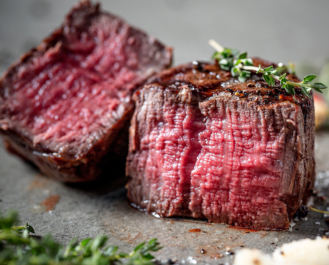 Филе-миньон Прекрасный выбор для тех, кто предпочитает более постное мясо: в нем нет жира. Стейк вырезается из пассивной мышцы быка, которая не задействована в движениях, соответственно, мясо получается нежным. Филе-миньон не так высоко ценится мясниками-профессионалами: они говорят, что это бесхарактерная часть, она неинтересная, «возьмите то, что нужно пожевать». Но, как правило, гости любят филе-миньон как раз потому, что он тает во рту. Расположение в туше: поясничная часть, вырезка Рекомендуемая прожарка: rare