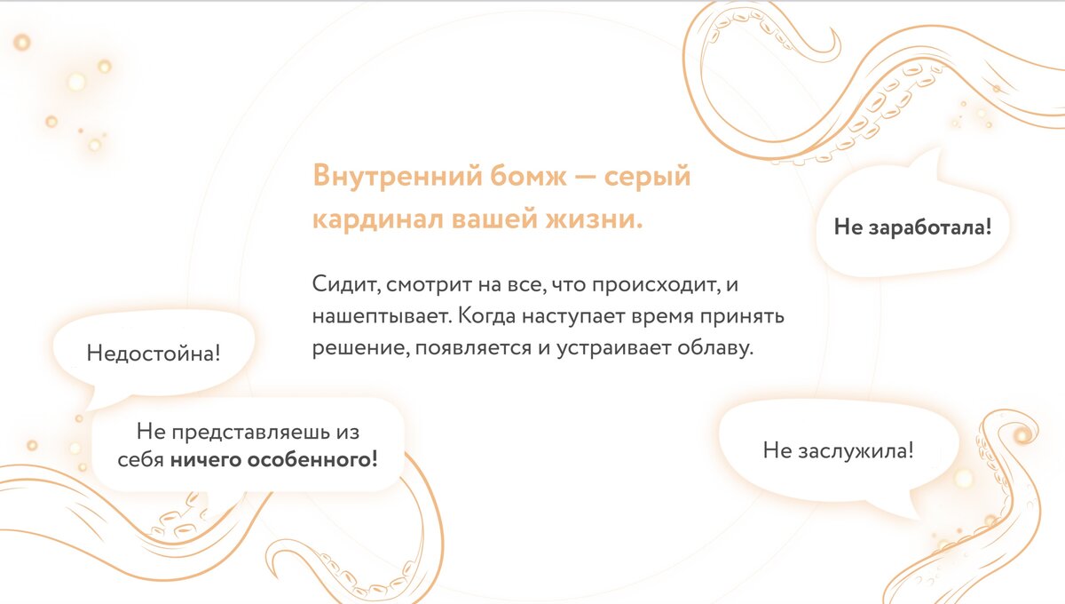 Есть у многих людей такая субличность — внутренний бомж. Это тот товарищ, который по рукам и ногам связывает нас, не пуская к богатству и изобилию. Он состоит из сотен и тысяч установок и травм. Каждая из них делает всё, чтобы вы не развивались и оставались на месте. Вообще, бомж имеет нас по всем сферам жизни. Предлагаю посмотреть на его поведение через классическое колесо баланса в каждой сфере. Пройдёмся по каждой сфере отдельно. Семья В отношении семьи внутренний бомж ведет себя так: ему очень важно заслужить любовь родителей, поэтому он готов жертвовать собой и своими интересами. Как это проявляется: сначала человек пошёл в институт, в который мама сказала, потому что не хочется бодаться и расстраивать ее. Потом работу выбрал стабильную, чтобы опять же с родителями не ссориться. Да и вообще «Юрист — это профессия, а художник — путь в нищету» Или, например, если человек поделился с кем-то чем-то важным и интересным для себя, но столкнулся с неприятием и непониманием, то из-з
