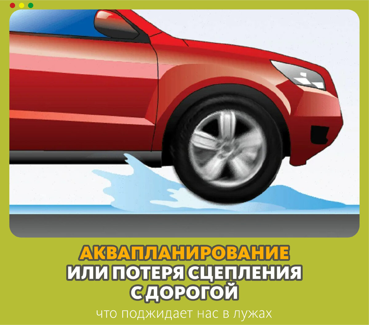 Разбираемся, что поджидает нас в лужах. Аквапланирование - неприятное явление, при котором автомобиль теряет сцепление с дорогой и «скользит» по воде. Не суетиться! Не тормозить! Не менять траекторию движения! Тормозите перед лужей, а не в ней. Но если очень надо - то двигателем. После лужи просушите тормоза: несколько раз нажмите на тормоза (не в пол!). Чуть-чуть, чтобы колодки нагрелись и вода испарилась. Ну и будьте аккуратнее на дорогах