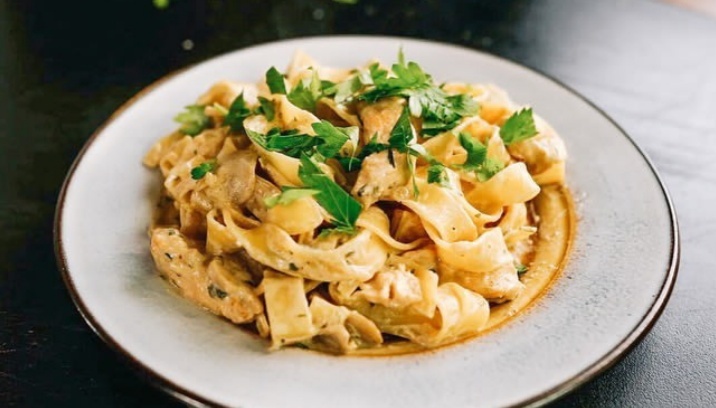- Соус посолить и поперчить. В готовую пасту добавляем курочку с соусом и посыпаем готовое блюдо сверху зеленью.