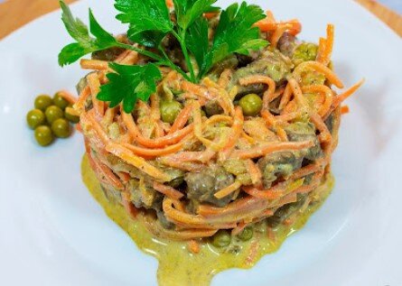Этот рецепт поможет вам удивить гостей! Салат полностью отвечает своему красноречивому названию. Очень сытный и невероятно вкусный – попробовав 1 ложку, вы вряд ли сможете остановиться. Есть несколько вариантов приготовления этого блюда. В этой статье рассмотрим классический рецепт. Печень – это главный ингредиент. Салат с куриной печенью получается очень нежным, но при желании, можно использовать свиную, говяжью, гусиную, индюшиную. Соленые огурцы придают особую кислинку и пикантность, а морковь и лук, обжаренные до золотистой корочки – приятный сладковатый вкус. Салат готовится 30 минут. Получается примерно 4 порции. Ингредиенты: • Печень куриная, говяжья, свиная, индюшиная или гусиная - 400 грамм
