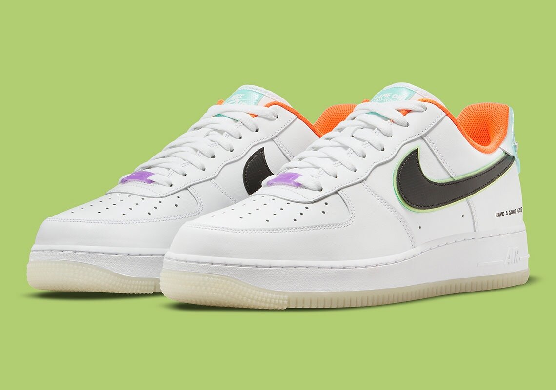В этой недавно открытой модели используется стандартная гладкая белая кожаная основа, но используется творческий подход с материалами и текстурами для своей части Swooshes и язычков на пятке. Swooshes получил цифровой вид с матово-черным сетчатым покрытием, напоминающим экраны компьютеров. Аквамариновые и зеленые пластмассовые детали позади Swooshes и на пятке также действуют как фурнитура, имитирующая внешний вид светодиодных фонарей. Подобно Nike Air Force 1 Pixel в коллекции, игровая графика также напечатана на язычках пятки. Даже текст «HAVE A GOOD GAME», найденный в других моделях, присутствует в этой паре. Завершает образ полупрозрачная резиновая подошва, добавляющая футуристический