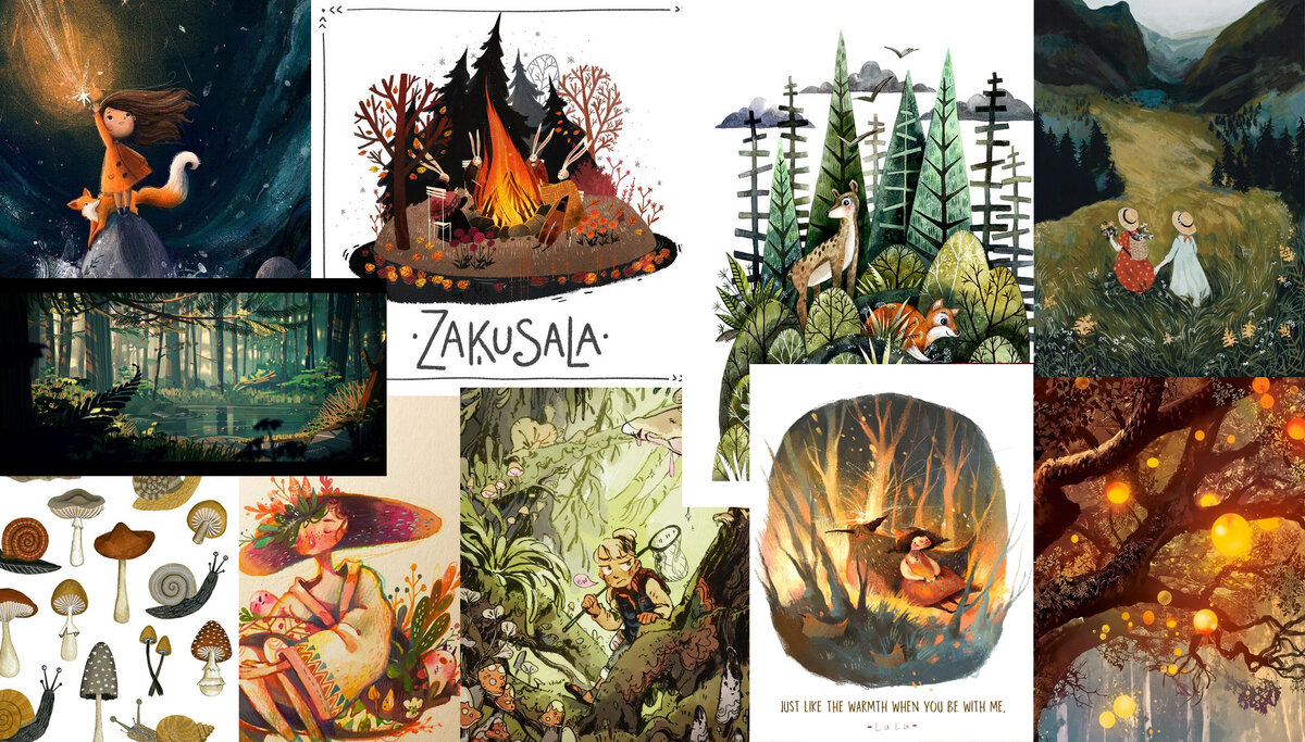 В нем я собрала иллюстрации, в которых мне понравилась цветовая гамма, стили, композиционное решение, детализация. Есть так же вспомогательные изображения грибочков и улиточек.