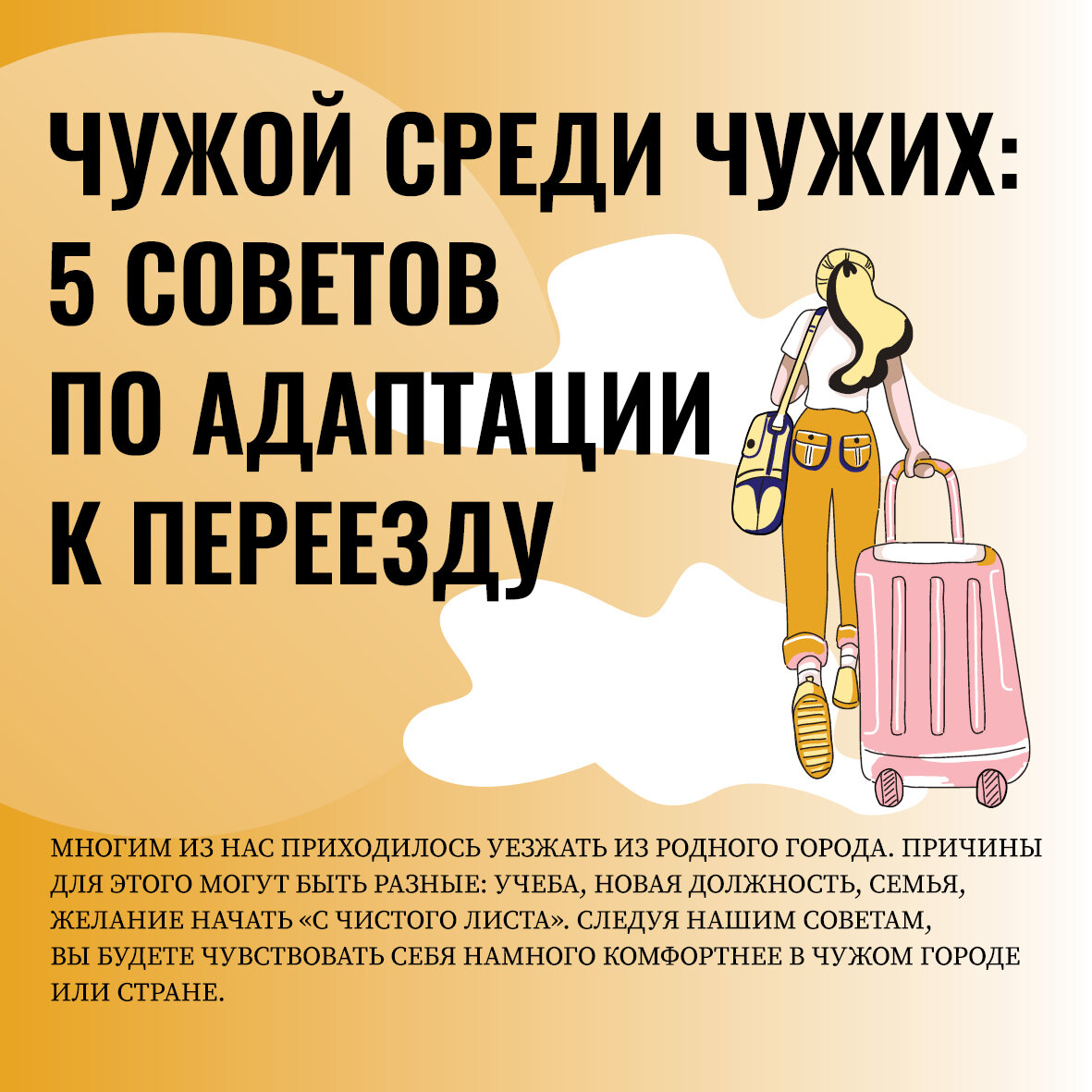 Ваш дом – ваша крепость В первое время, когда все кажется чужим и враждебным, важно найти уголок, который станет спасительным островом в бушующем океане новых улиц, заведений, людей. Обустройте свое жилье с максимальным комфортом и уютом. Повесьте на стены фотографии друзей и родственников, поставьте на полки любимые книги, постелите у кровати мягкий ковер: в общем, сделайте так, чтобы новое место жительства стало вашим домом, в который захочется вернуться после напряженного дня. Станьте исследователем Постарайтесь изучить новый город: начните с заведений, находящихся в вашем районе, улиц, близлежащих парков, магазинов... Притворитесь ненадолго беззаботным туристом. Не стоит также пренебрегать знакомством с соседями: к кому вы обратитесь, если вам внезапно понадобится соль или штопор? Станьте частью этого города, если хотите сделать его своим домом. Работа – не волк И учеба тоже. Не зацикливайтесь на своей основной деятельности. Безусловно, хороший студент закрывает сессию вовремя, а х