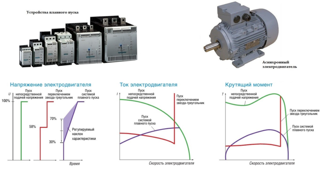 Поскольку ток двигателя пропорционален напряжению питания, устройства плавного пуска значительно ограничивают пусковой ток, и увеличение крутящего момента двигателя постоянно адаптируется к нагрузке ведомого устройства. Это надежно исключает механические удары, а также падения напряжения в питающей сети.