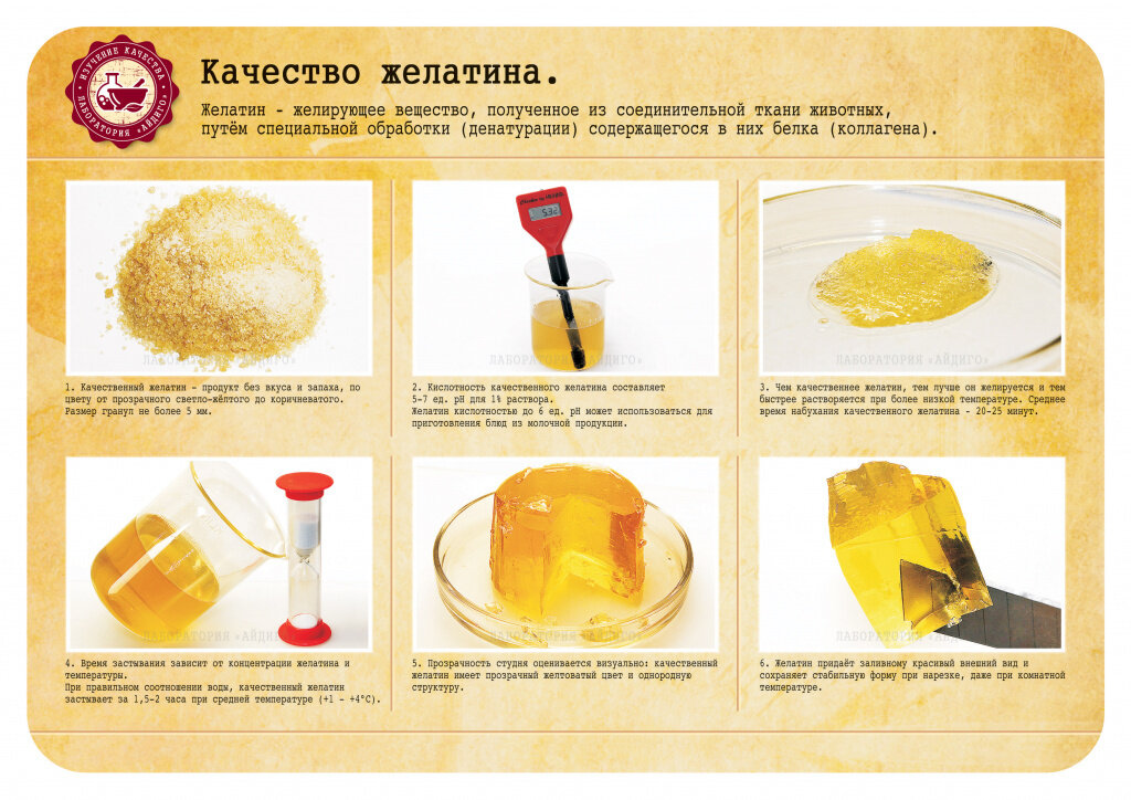 О том, что такое желатин и как определить его качество расскажут эксперты компании «Айдиго». Что такое желатин? Слово «gelatus» переводится с латинского как «застывший» и отражает предназначение этой специи, так как именно она создают необходимую консистенцию множества блюд. Желатин представляет собой желирующее вещество, которое получают из костей, кожи, хрящей животных или рыб. Кости вывариваются, из бульона экстрагируется желатин, полученный раствор процеживается, очищается, сгущается в вакуумной установке, высушивается и измельчается в порошок. Контроль качества желатина Качественный желатин по физико-химическим показателям должен соответствовать ГОСТ 11293-89 «Желатин. Технические условия». Основными показателями качества желатина являются: внешний вид порошка (цвет и размер гранул), доля влаги, кислотность раствора, продолжительность растворения, прозрачность и прочность студня. Внешний вид желатина: каким он должен быть Качественный желатин- продукт без вкуса и запаха, цветом от