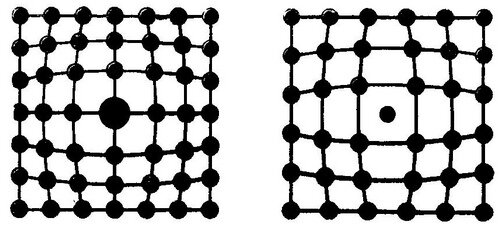 Из-за того, что растворенные атомы отличаются своей природой и размером от атомов кристалла, их наличие искажает кристаллическую решетку.