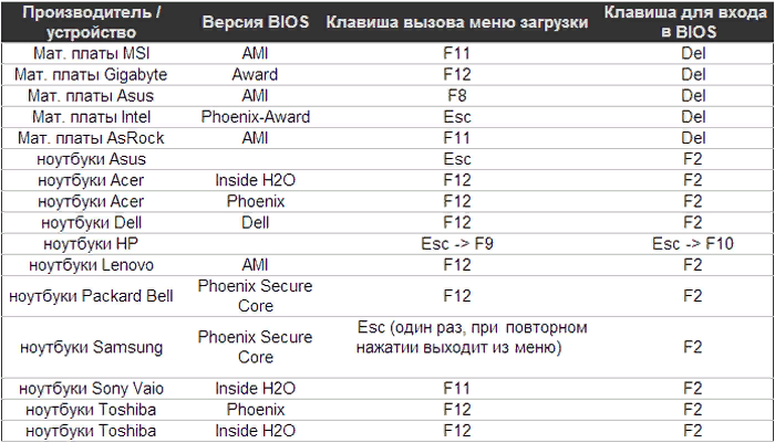 Установите в Usb порт вашего компьютера/ноутбука загрузочную флешку с Windows 10. Подключаем сразу в USB порт 3.0. Если загрузка не пошла, либо появились какие-либо ошибки попробуйте переподключить в USB 2.0 (если такой есть). Далее изменим порядок загрузки устройств. В современных компьютерах и ноутбуках можно выбрать «быструю загрузку» при включении, нажимая как правило F8 на компьютерах, и F11 или F12 или Esc на ноутбуках. Если при нажатии этих кнопок ничего не появилось нужно зайти в биос. На разных устройствах нужно нажимать разные кнопки во время включения компьютера для входа в него. Подробнее о кнопках на картинке.