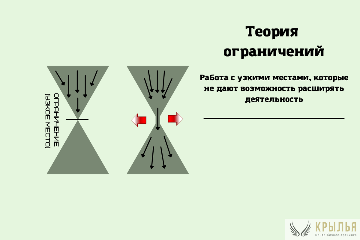 Компания способна выйти на неограниченный доход, но только при выборе верного подхода. "Это невозможно",- скажут скептики. По факту, нет ничего невозможного. И такого же мнения придерживается Элиях Голдратт. К качестве подобного подхода выступает Теория ограничения систем (от английского Theory of Constraints), разработанная в 1980-х года. Суть методологии заключается в постоянной работе с ограничениями, узкими местами деятельности, которые не дают возможность развивать и расширять деятельность. Если что-то не работает, нужно найти “узкое” место и расширить его, повысив производительность. Автором подхода является Элиях Голдратт. Он убежден, что эффективность любого рода деятельности заключается в умении работать с ограничениями. Ограничения могут проявляться в виде убеждений, которые плотно засели в подсознании, либо в виде слабых мест производства, которые не дают расширить дело. Кроме этого не нужно работать над всеми ограничениями сразу, это неэффективно. Проблем может быть н