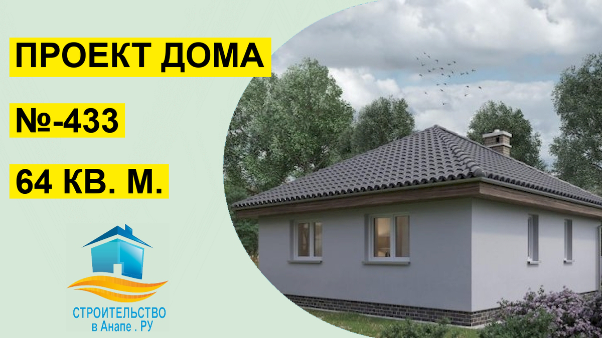 Проект одноэтажного дома 64 квадратных метров (№-433) на Черноморском побережье. Индивидуальный коттедж на берегу Чёрного моря - мечта для большинства жителей страны. Недостаток солнечной активности в центральных регионах России, сложные условия проживания в сибирских регионах подталкивают задуматься о приобретении жилья в южных районах. Главный шаг в реализации желаемого о своем доме - проект одноэтажного дома 64 квадратных метров (№-433). Наша организация в Анапе специализируется на создании проектной документации и строительстве жилых и коммерческих зданий. Проектировщики, архитекторы разработали десятки объектов различной планировки и площади. Вас интересует особое решение? Ставьте задание и мы отошлем предварительную смету и эскизный проект на указанную вами e-mail почту. Довер
