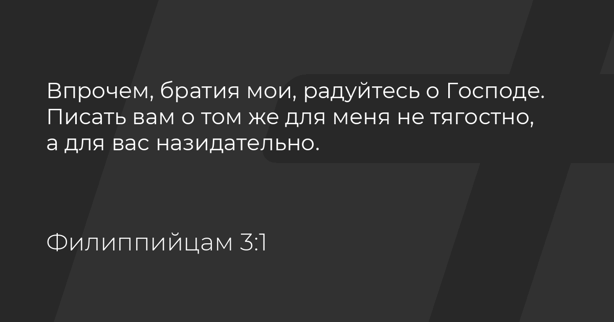 «Впрочем, братия мои, радуйтесь о Господе. Писать вам о том же для меня не тягостно, а для вас назидательно. Берегитесь псов, берегитесь злых делателей, берегитесь обрезания, потому что обрезание — мы, служащие Богу духом, и хвалящиеся Христом Иисусом, и не на плоть надеющиеся» (Фил. 3:1-3).