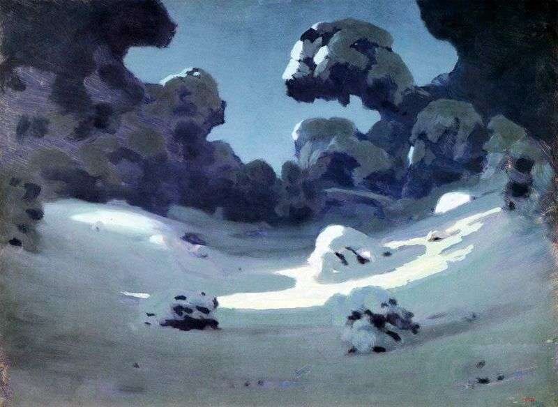 Зимний лес Куинджи притягателен, он завораживает, он один в один похож на сказку, знакомую с детства, но слегка подзабытую. Вместе с тем, здесь присутствует свет не только “родной” луны; помимо нее, волшебство пейзажа усилено сиянием, исходящим из загадочного космического источника. Огонь этих двух миров, органично дополняющих, и усиливающих друг друга, стал свидетельством покорения художником новой творческой вершины.