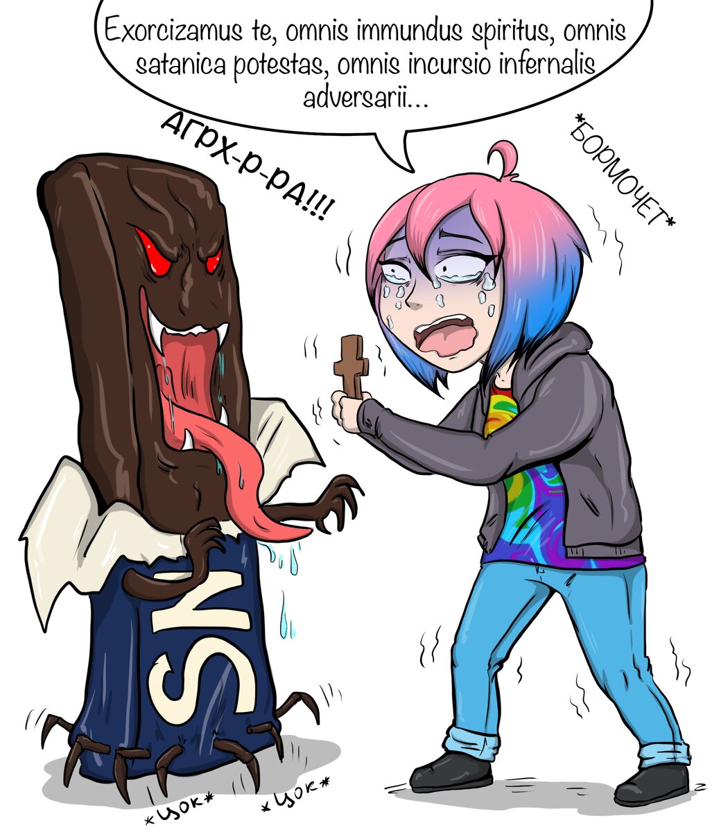 Я постоянно выкладывала на кассе шоколадки из корзины. Причём, клянусь, я не помню, что клала их туда! Мне это подкинули! Это не моё! Я рыскала по дому в поисках заветренной конфетки, согласна была даже на надкушенную. Да, человек может пасть так низко... Во сне меня атаковали огромные сникерсы и марсы, это было ужасно. Они снимали с себя обёртку и бежали ко мне с криками: "Съешь меня!", в итоге я просыпалась с уголком одеяла во рту.