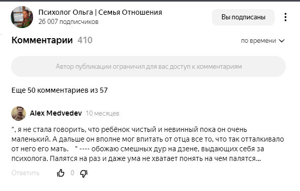 Эта особо выдающаяся. Выдает себя за психолога, на попытку попросить показать диплом отреагировала неадекватно. Поведение не свойственное людям имеющим реальную психологическую практику и соответствующее образование. Честно говоря не видел ни одного психолога или психотерапевта, который бы боялся разговаривать с людьми - у них же в этом смысл работы. А тут на неприятные вопросы псевдопсихологиня отреагировала как обычная начальница шлагбаума - вы мне мешаете окормлять! Она несет чушь, которая противоречит всей современной психологической науке, особенно возрастной, внушает людям фейковые идеи и считает, что это норма. Особенно это интересно на фоне заявления Яндекса, что у них типа работает фактчекинг от Высшей школы экономики. Что-то не заметно, если подобные гражданки здесь подобные высказывания допускают.