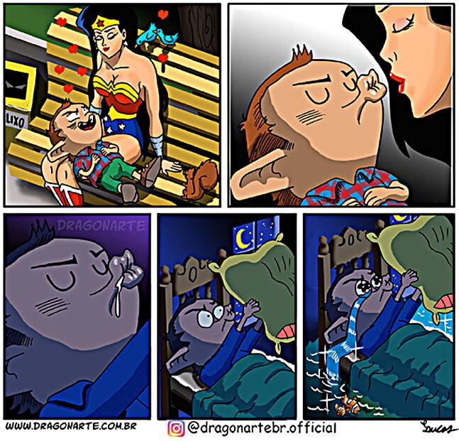 Она - сильная, красивая и воинственная героиня комиксов. Подруга Бэтмена сражается со злодеями и покоряет сердца зрителей. Сегодня вас ждёт подборка историй о Диане, отважной амазонке из Лиги Справедливости. От бразильского художника Lucas Nascimento. Он вдохновляется любимыми персонажами из комиксов и создаёт весёлые мини-зарисовки под ником Dragonarte, выкладывая свои работы в Instagram и в Facebook. Мини-зарисовки Драгонарта про супергероев, понятны без слов читателям из разных стран и всегда могут удивить. А ещё они наполнены спрятанными пасхалками. Так что не забудьте посмотреть на арты чуть внимательнее, чтобы найти скрытые детали или персонажей из других известных мс и комиксов. Готовы улыбнуться историям об амазонке? Тогда начнём! Ах, мечты, мечты... Кстати, себя художник изображает в виде забавного коротышки. Судя по нескольким комиксам ниже, воительница ему очень нравится. Он даже создаёт забавные иллюстрации о встречах с ней во снах. Романтичная встреча Это одна из иллюстр
