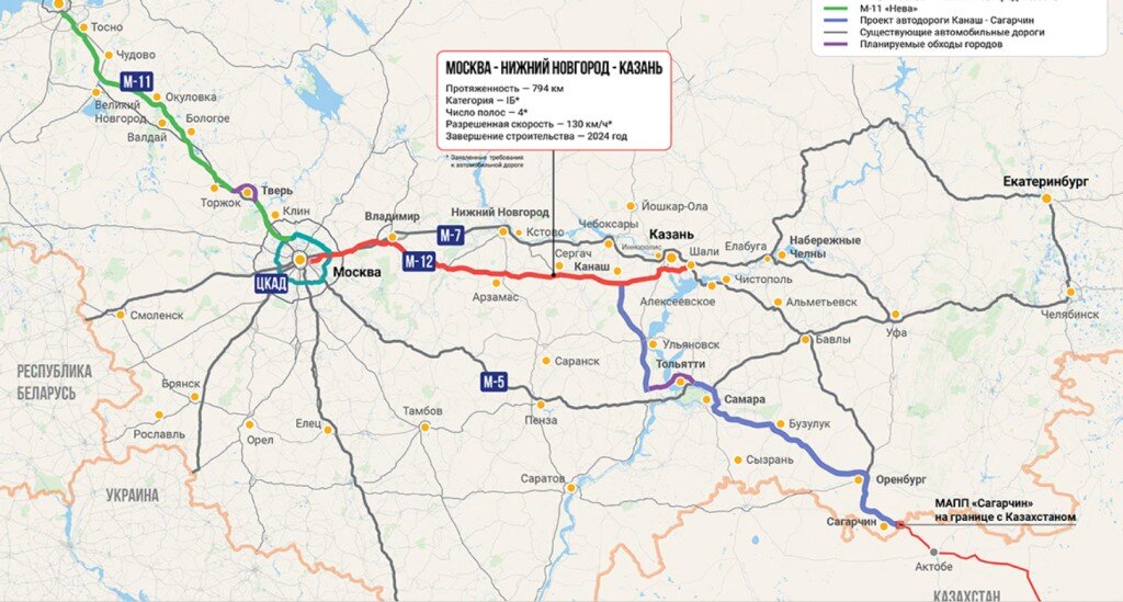 Строительство трассы М-12 «Москва – Нижний Новгород – Казань» началось прошедшей зимой. Это платная скоростная автомагистраль, часть международного транспортного маршрута «Европа – Западный Китай», воссоздающего исторический Великий шелковый путь. Проект разработала госкомпания «Автодор». Трасса пройдет по территориям Подмосковья (в обход городов Балашиха и Ногинск), Владимирской и Нижегородской областей, а также через Чувашскую Республику и Республику Татарстан.