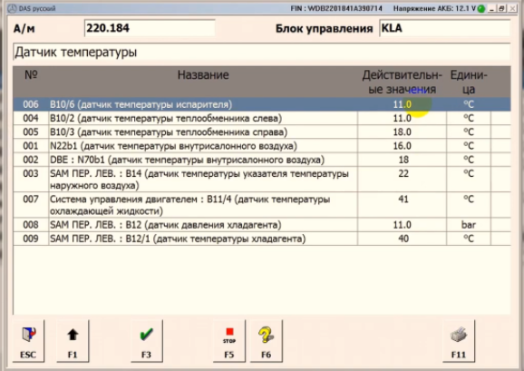 При наступлении аномальной жары все больше автомобилей начинает приезжать с проблемами системы кондиционирования. Посему начинаем диагностику. После того, как мы подключили сканер, проверяем блок климат-контроля или кондиционер на наличие ошибок. В некоторых авто очень интересно работает система диагностики: при входе в коды ошибок система автоматически запускает самодиагностику. Пока нет никаких ошибок, но… Нам необходим просмотр действительных значений. Давление в системе. Заходим в параметры и находим датчик давления хладагента, показывает 5 Бар. Пока автомобиль не заведен, и не включен компрессор кондиционера, мы будем иметь рабочее давление не ниже 4 Бар. Заводим автомобиль, выставляем на климат-контроле минимальную температуру и максимальный поток воздуха. Давление начинает плавно подниматься. Датчик температуры испарителя. Сейчас у нас значение 11, по скорости падения этой температуры мы будем определять эффективность работы системы кондиционирования. Чем ниже температура испари