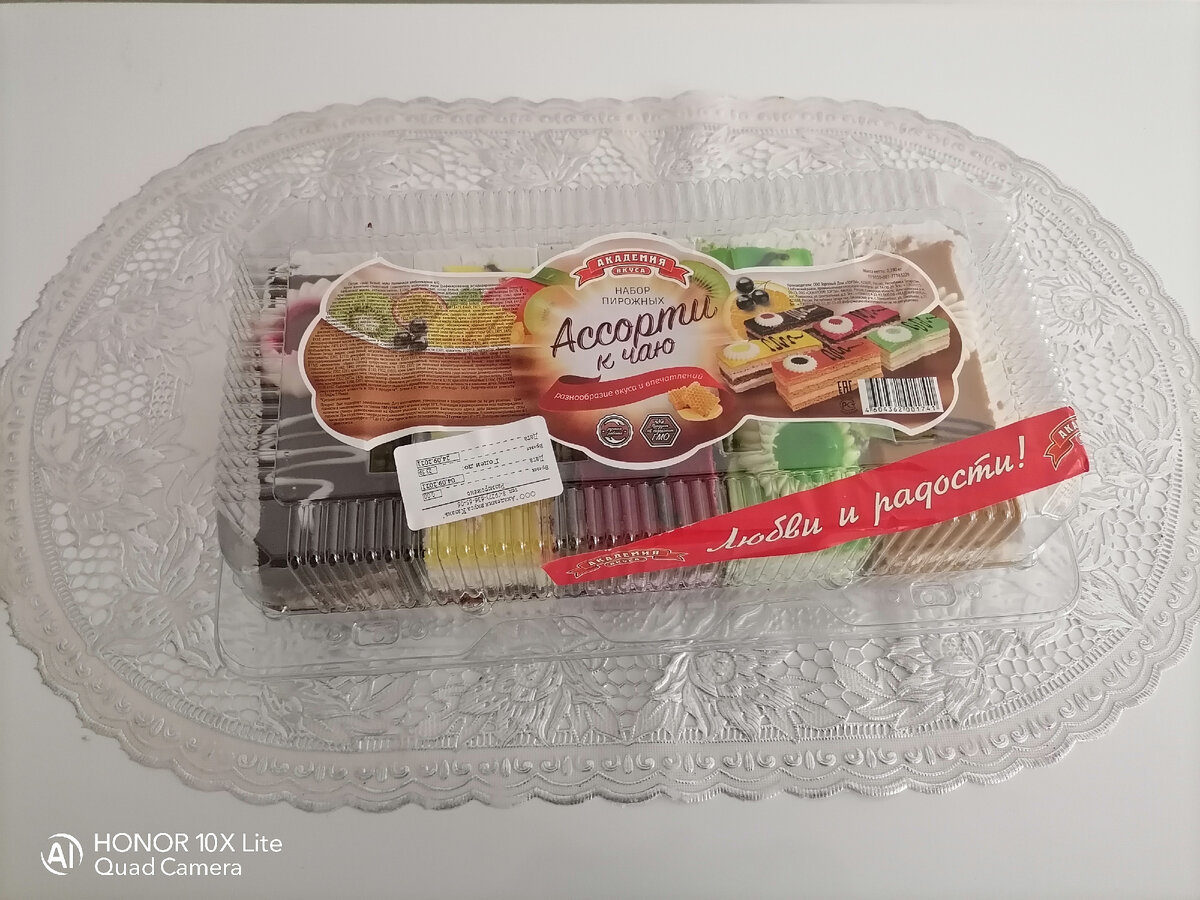 Стоимость таких пирожных 199 рублей. В ассорти входит 5 разных пирожных. В принципе, это не дорого.