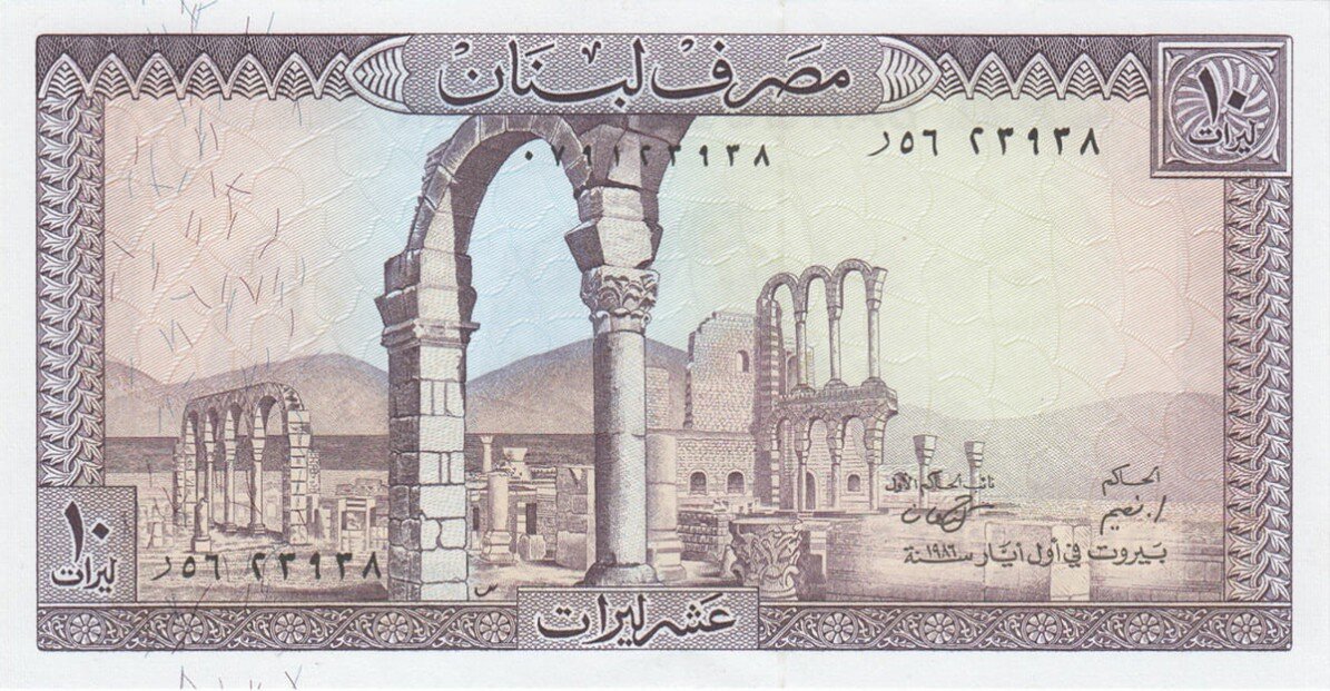 Официальная валюта Ливана — ливр (он же ливанский фунт), состоящий из 100 пиастров. Банкноты 10 ливров выпускались Банком Ливана девять раз в период между 1964 и 1986 гг. Из-за инфляции они уже много лет назад вышли из обращения, и сейчас самая мелкая купюра Ливана — 10 000 ливров. Банкнота представленная в данном обзоре, принадлежит к последней серии 1986 г. Размер банкноты: 145×75 мм. На водяном знаке изображен мужчина по пояс в традиционной одежде. Из других защитных средств присутстует: число 10 арабскими цифрами, которое светится в ультрафиолетовом излучении (повторяется в левой части банкноты крупными цифрами и дважды мелкими в центре), а также люминесцентные желтые волоконца, случайно разбросанные по поверхности банкноты. Кроме того, по вертикали идет прерывистая защитная нить и симметричная ей слегка флуоресцирующая синяя полоса. Как и на всех остальных ливанских банкнотах, надписи на лицевой стороне сделаны на арабском языке, а на обороте — на французском. Лицева