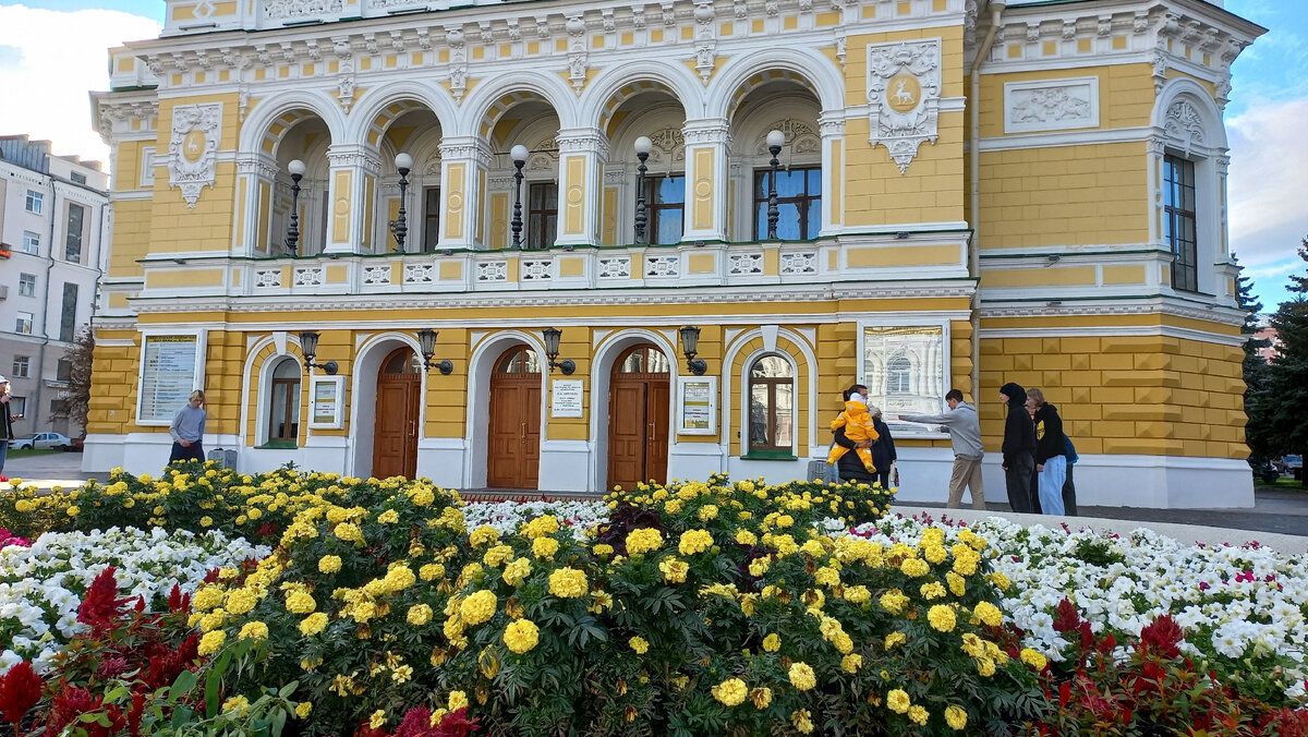 Пешеходная улица в Нижнем Новгороде носит имя Большая Покровская по названию Покровской церкви, снесенной в 1935 году. На этой прогулочной улице находится красивое, яркое, привлекающее всеобщее внимание здание Драматического театра, окруженное театральной площадью и сквером. Это одно из старейших театральных зданий построенное в 1896 году к Всероссийской выставке. Театр по традиции открывался премьерой оперы Глинки "Жизнь за царя". В главных партиях блистали молодой Шаляпин и Надежда Забела-Врубель, супруга известного художника Михаила Врубеля. Драматический театр носит имя Горького, на его сцене ставились все пьесы писателя. Яркое, нарядное здание театра украшает пышный театральный декор. Символ Нижнего Новгорода - олень - так же присутствует в оформлении здания. А на скамейке на театральной площади с 2006 года сидит выдающийся российский актер. Евгений Евстигнеев родился и вырос в Нижнем, закончил театральное училище и здесь же начинал свою актерскую карьеру. С таким замечательным ч