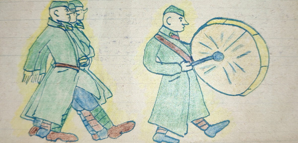 Подъем в шесть часов. Идем на зарядку, на улице морозно. Осмотр внешнего вида, слушаем радио и идем на строевую. Ходили под барабан ровно час.