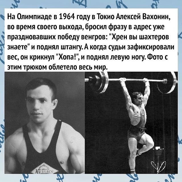 В 1️⃣9️⃣6️⃣4️⃣ г. стал олимпийским чемпионом, в результате сложной борьбы с венгерским тяжелоатлетом Имре Фёльди. Для этого Вахонину в последней попытке необходимо было взять вес в 142,5 кг, что и сделало советского тяжелоатлета чемпионом. Обрушились аплодисменты, но Вахонин не опускает штангу. Поджимает одну ногу и, как аист, стоит на помосте, произнеся знаменитое: «Хо-па!».